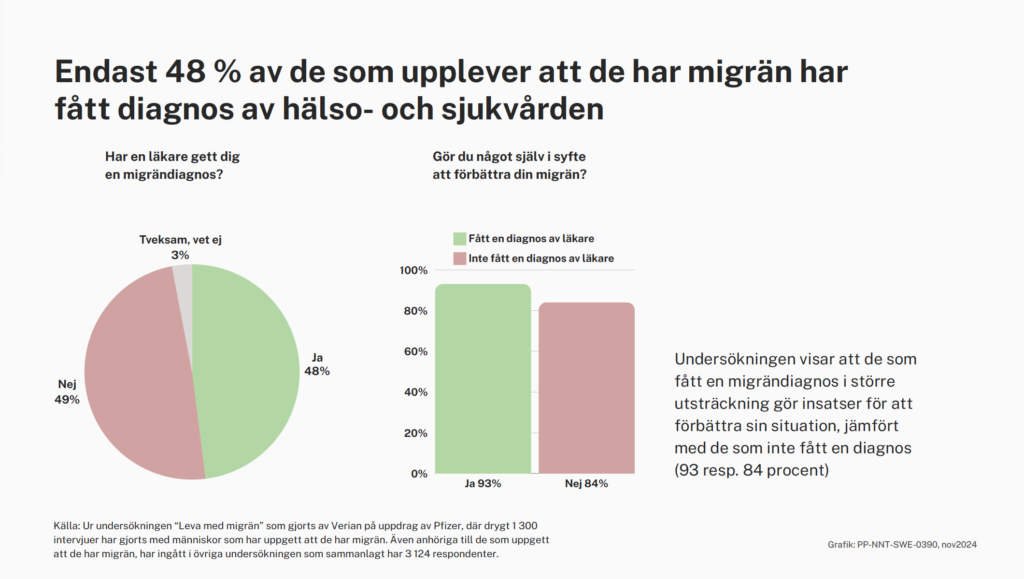 Enligt undersökningen ”Leva med migrän i Sverige”, som är genomförd av undersökningsföretaget Verian på uppdrag av Pfizer, uppger endast 48 procent av de tillfrågade personer som upplever att de har migrän att de fått diagnos från hälso- och sjukvården. Tre procent är tveksamma eller vet inte om de fått diagnos.
